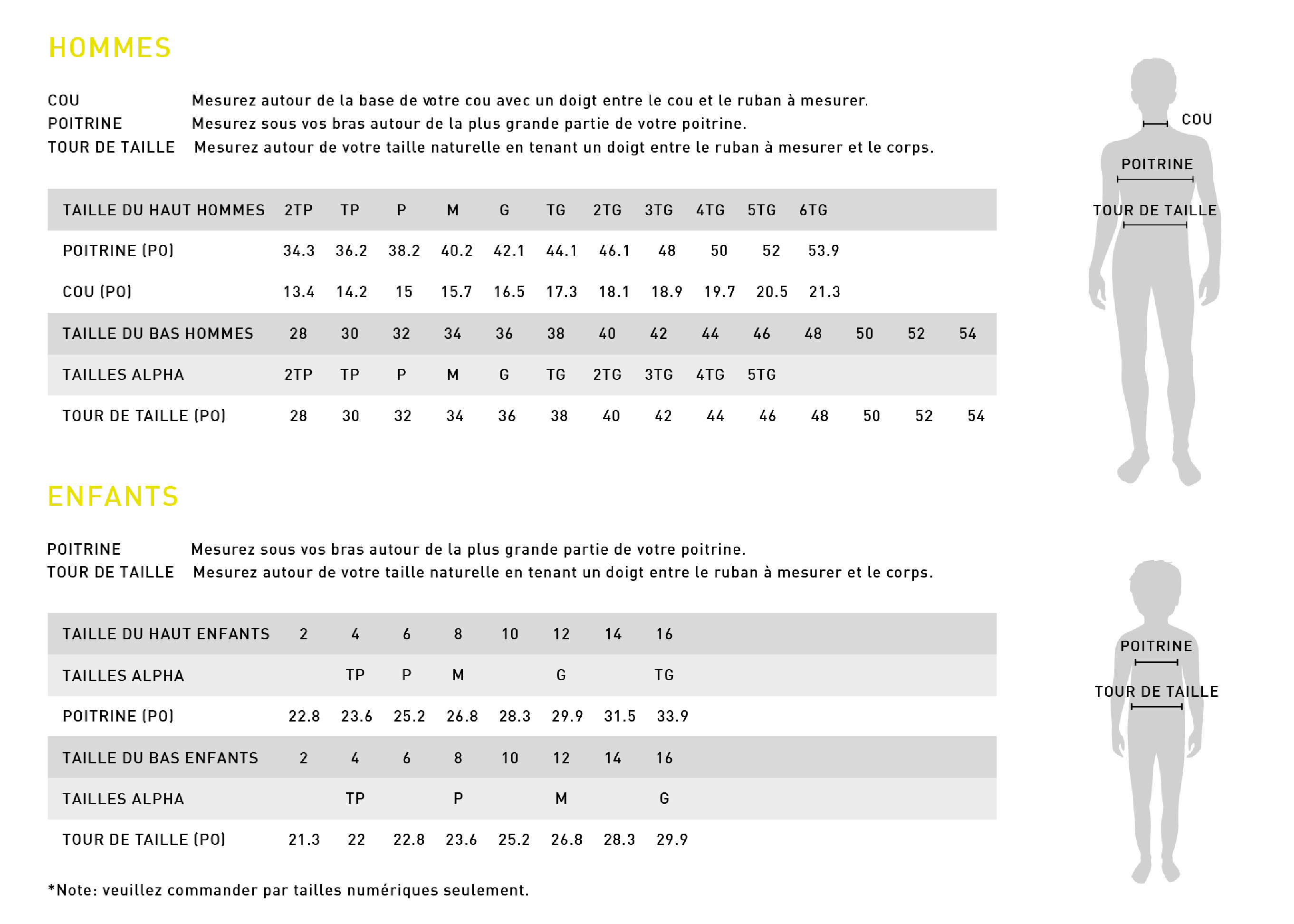 | Adulte | XS, S, M, L, XL, 2XL, 3XL, 5XL |